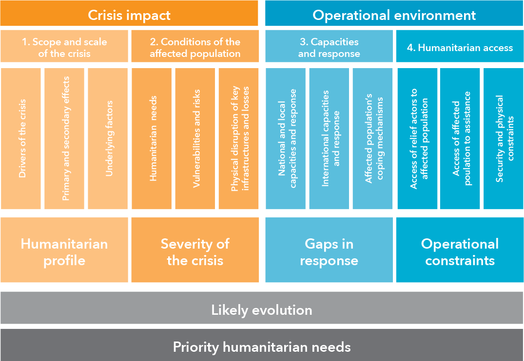 Key agencies should initiate a coordinated needs assessment at the start of a humanitarian emergency to provide an understanding of the crisis, including how it may continue to develop, and identify gaps in response and any operational constraints. This assessment should consider both the crisis impact (scope and scale of the crisis, how people are affected) and the operational environment (capacities, humanitarian access) (Fig. 8).