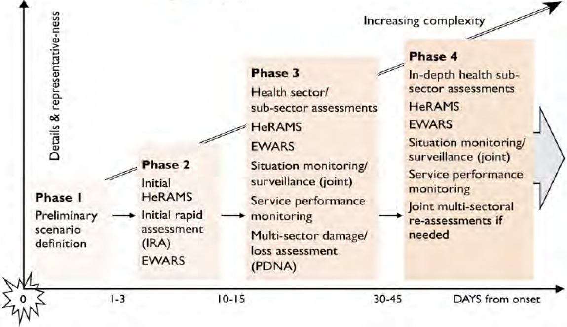 Fig. 9 Coordinated assessment and phases (HeRAM: Health Resources Availability Monitoring System, EWARS: Early Warning, Alert and Response System, PDNA: post disaster needs assessments) (25)