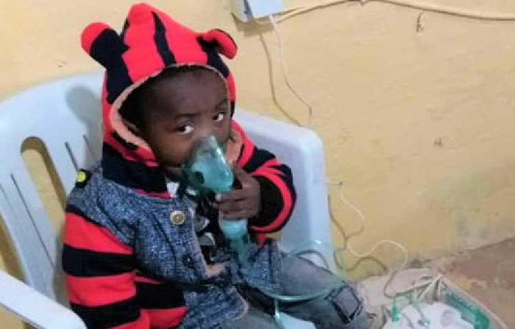 A girl with asthma breathes through a nebulizer at a settlement for displaced people in Ajdabiya, Libya, where medical teams supported by OFDA visit.