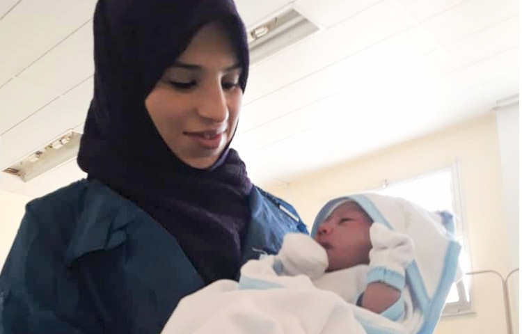 An obstetrician on a WHO team in southern Libya holds a newborn.