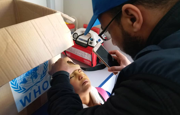 During a visit to a school in Ajdabiya, Libya, an ophthalmologist from a WHO emergency team examines a child’s eyes using the torch from his mobile phone. Funding from OFDA supports this team and others.