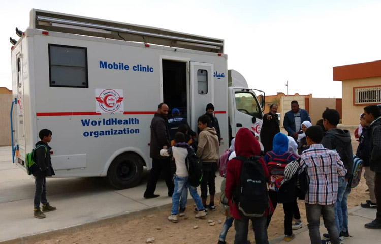 A WHO mobile clinic in an isolated area in the east of Libya. WHO Libya sends emergency medical teams to reach patients in camps and remote areas.