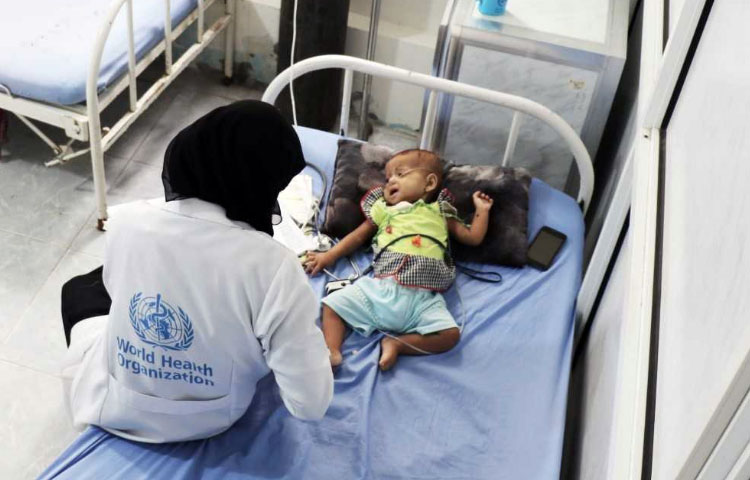 Sanad, 1 year, is diagnosed with severe acute malnutrition and receiving specialized treatment in the WHO-supported therapeutic feeding centre in Al-Thawra Hospital in Al-Hudaydah. Like most families, Sanad’s mother struggles to buy medicines or pay for transportation to the hospital.