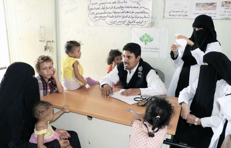 Two emergency mobile medical teams provide health services to IDPs in schools in Al-Hawak and Al Hali districts of Al-Hudaydah governorate. Deployed by WHO, each team consists of 5 personnel – a medical practitioner, vaccination specialist, pharmacist, nurse, and nutritionist. The teams are on the ground three times a week to provide primary health care services, including medical examinations, vaccination, as well as birth attendance. They also provide medicines, including for the Integrated Management of Childhood Illness (IMCI). Cases in need of referral are transported to the nearest hospitals. The main health concerns prevalent in the designated areas are watery diarrhoea and skin inflammations.
