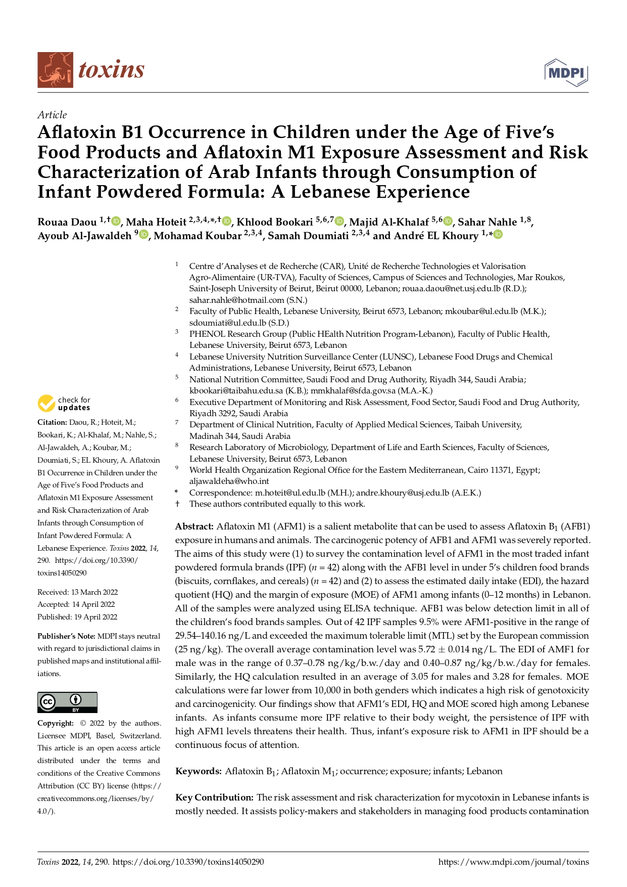 Aflatoxin b1 occurrence in children under the age of five’s food products and aflatoxin m1 exposure assessment and risk characterization of Arab infants through consumption of infant powdered formula: a Lebanese experience