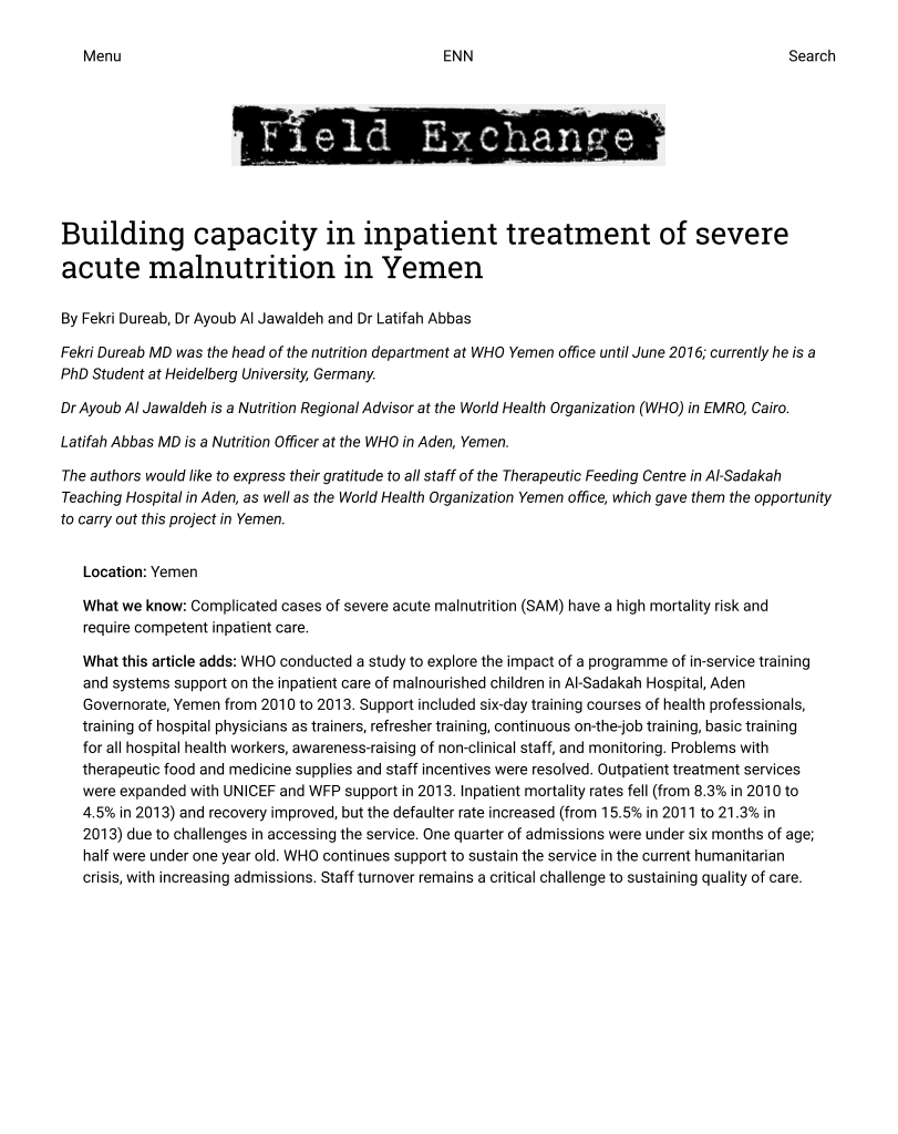 Building capacity in inpatient treatment of severe acute malnutrition in Yemen