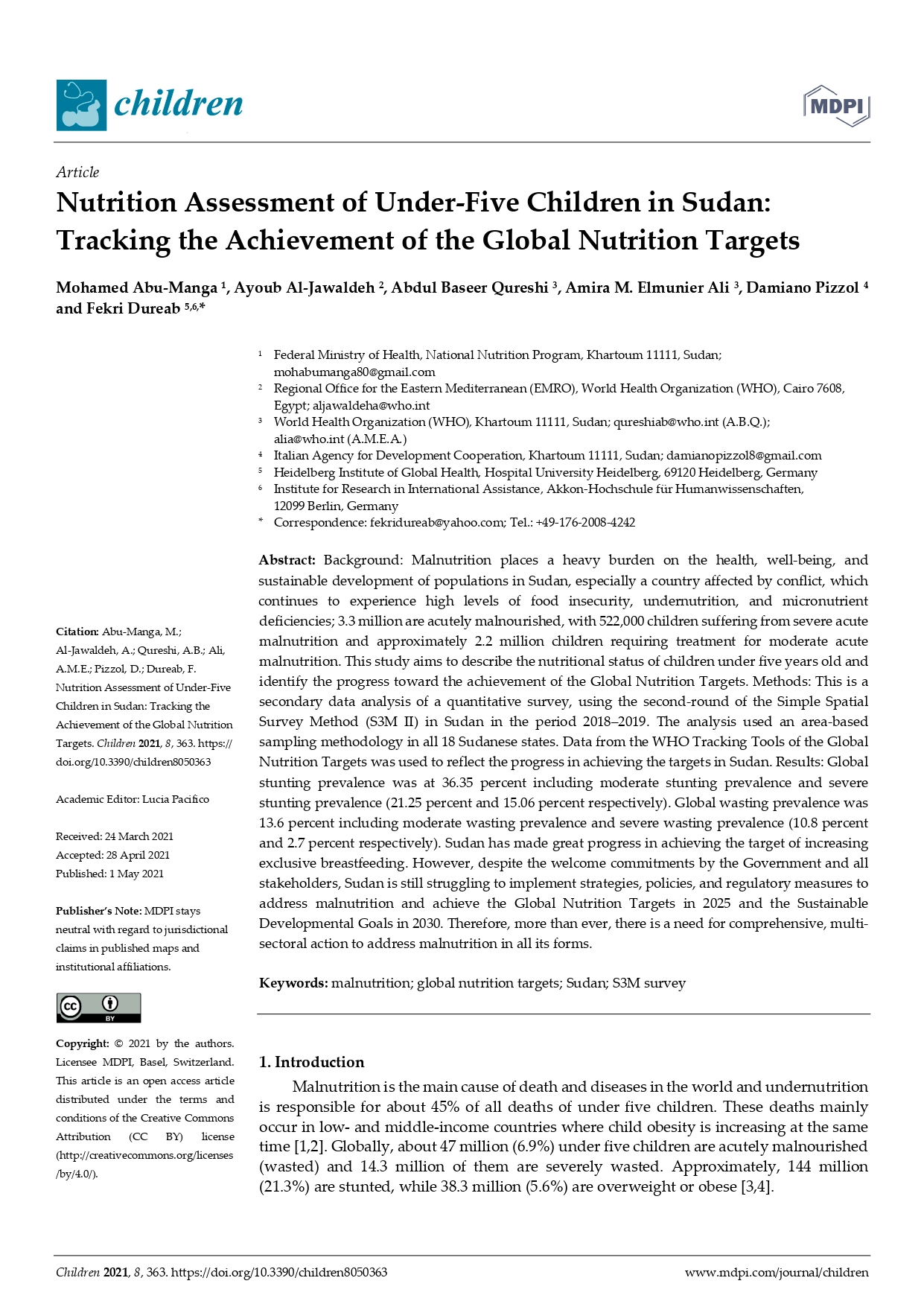 Malnutrition places a heavy burden on the health, well-being and sustainable development of populations in Sudan, especially a country affected by conflict, which continues to experience high levels of food insecurity, undernutrition, and micronutrient deficiencies. This study aims to describe the nutritional status of children under five years old and identify the progress toward the achievement of the Global Nutrition Targets. Despite the welcome commitments by the Government and all stakeholders, Sudan is still struggling to implement strategies, policies and regulatory measures to address malnutrition and achieve the Global Nutrition Targets in 2025 and the Sustainable Developmental Goals in 2030. Therefore, more than ever, there is a need for comprehensive, multi-sectoral action to address malnutrition in all its forms.